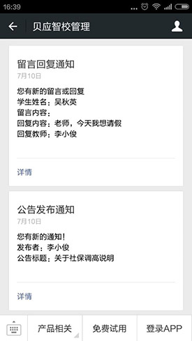 老师微信端:实时推送校园公告,学员留言自动提醒,与学员沟通无阻,有效避免信息滞后造成的沟通障碍。